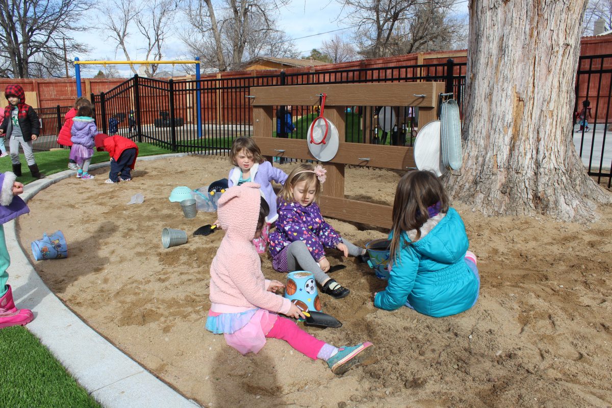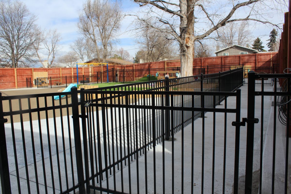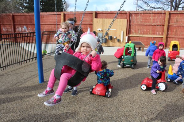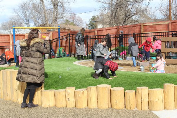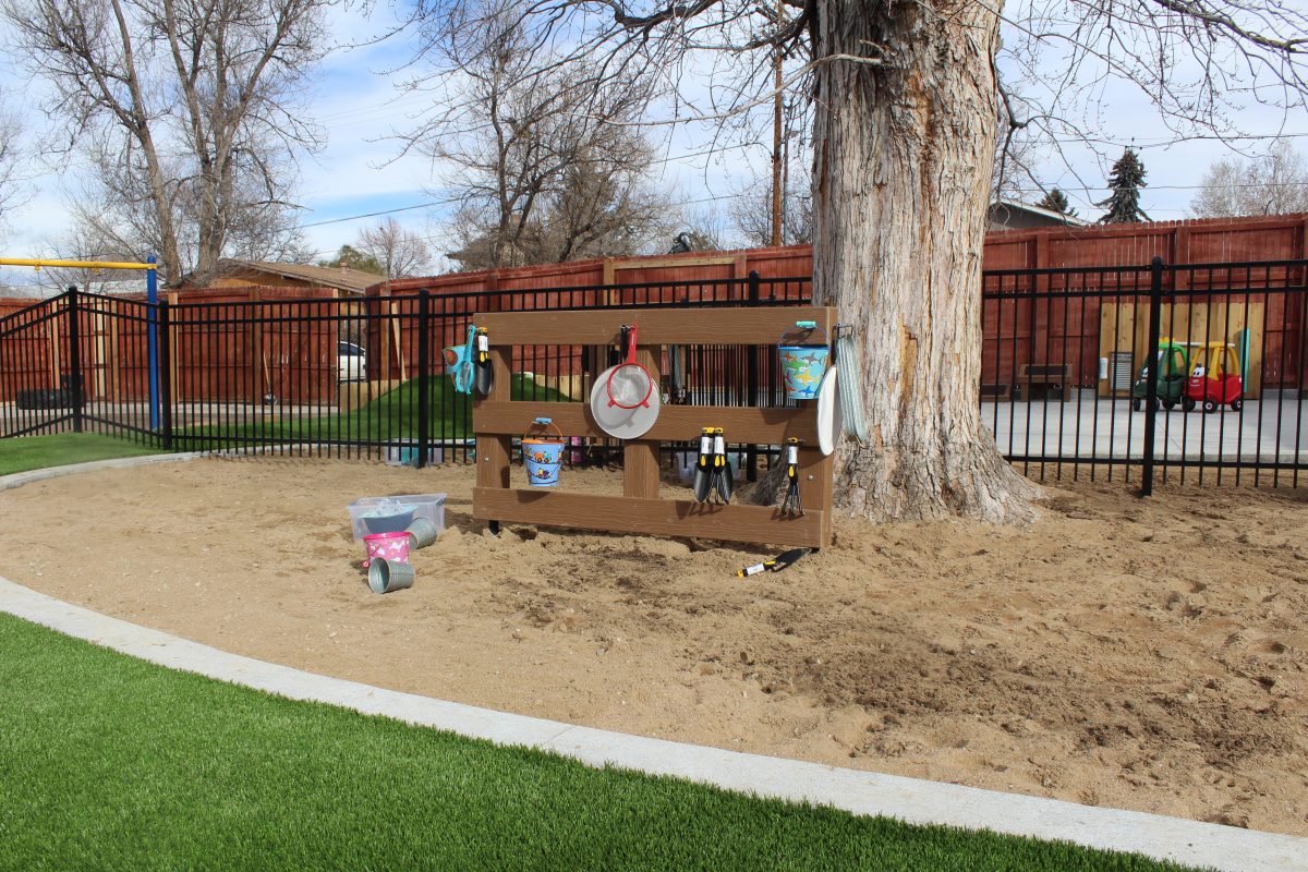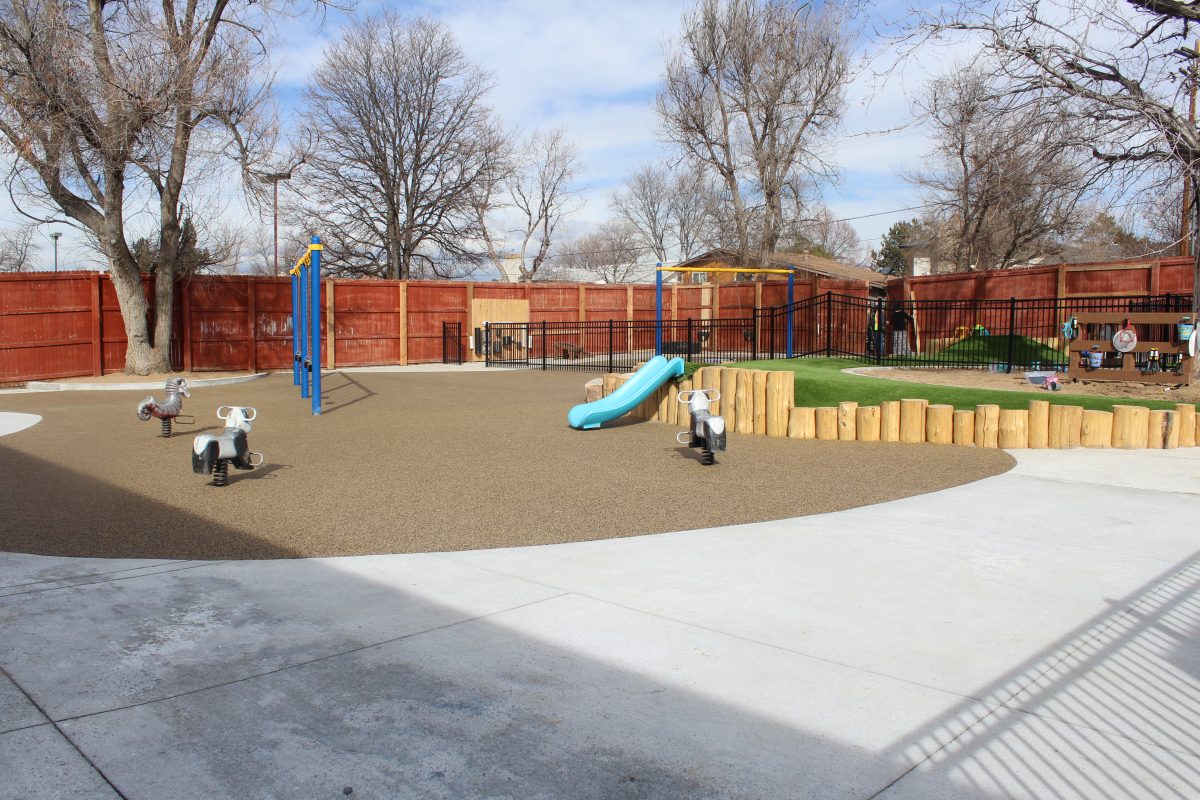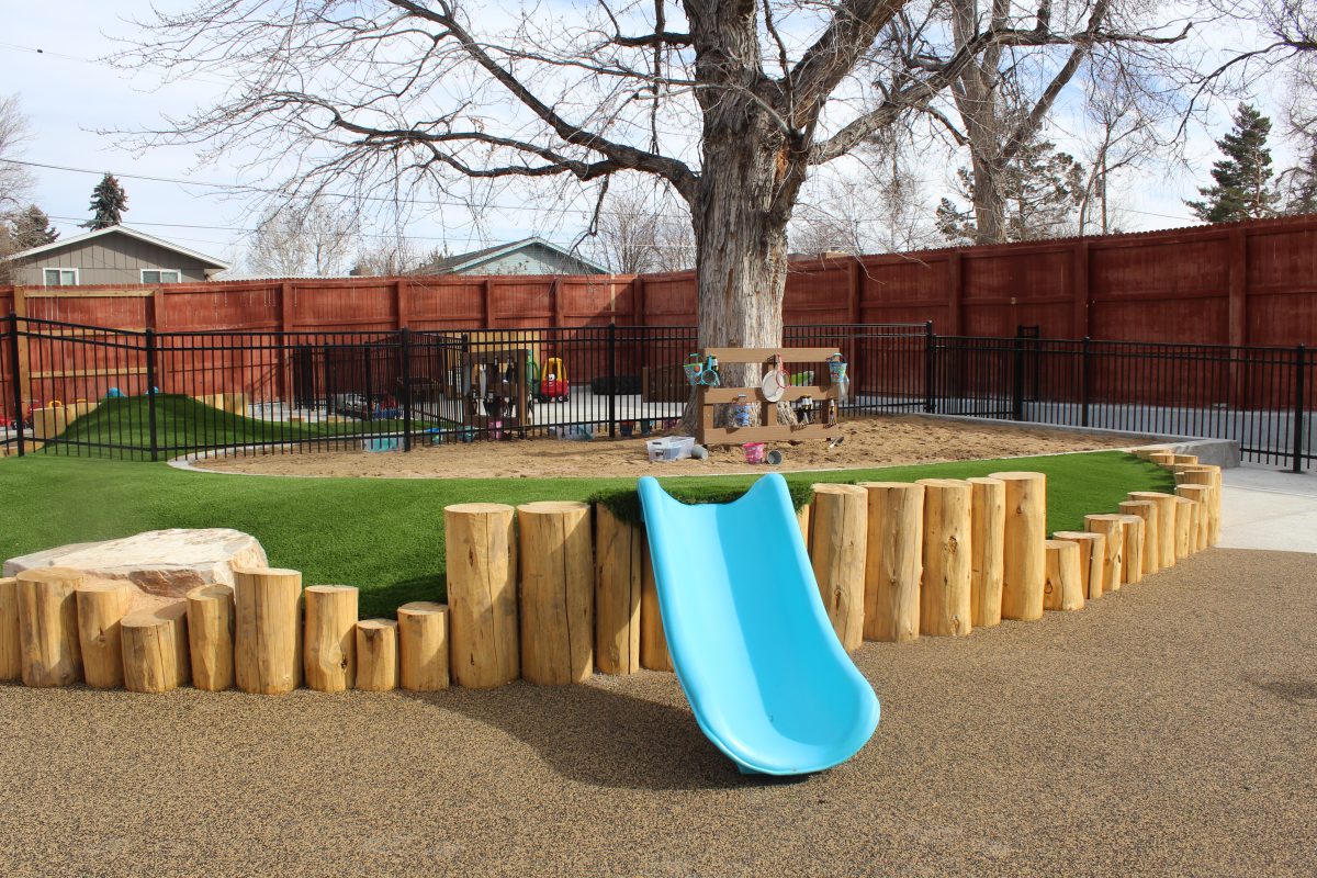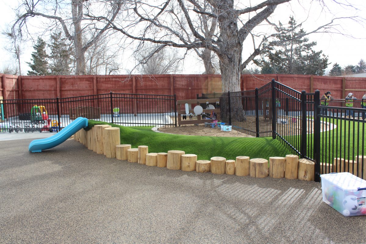 The playground, designed and built by Designscapes Colorado with input from the preschool, is a modern, thoughtful, and safe outdoor playspace for all children of all abilities featuring music walls, mud kitchens, garden boxes, green spaces, sandboxes, swings, logs and rocks for climbing, and so much more. The new playground is inspired by nature and encourages active, imaginative play.